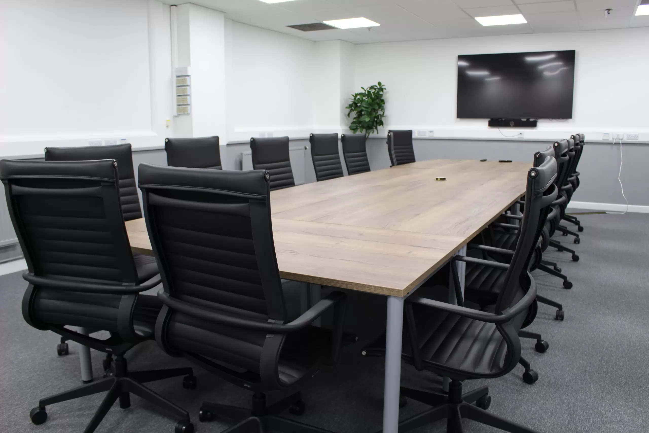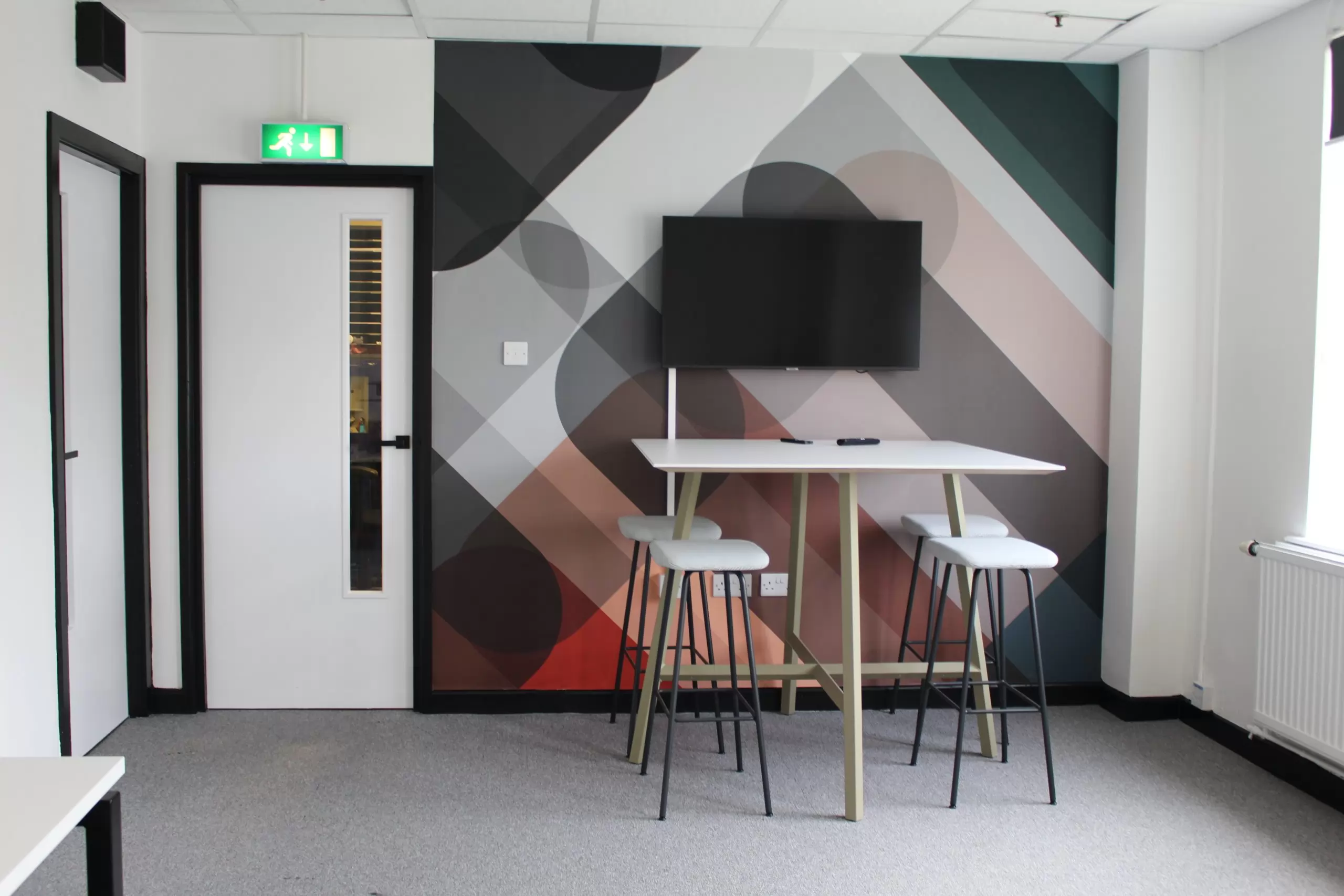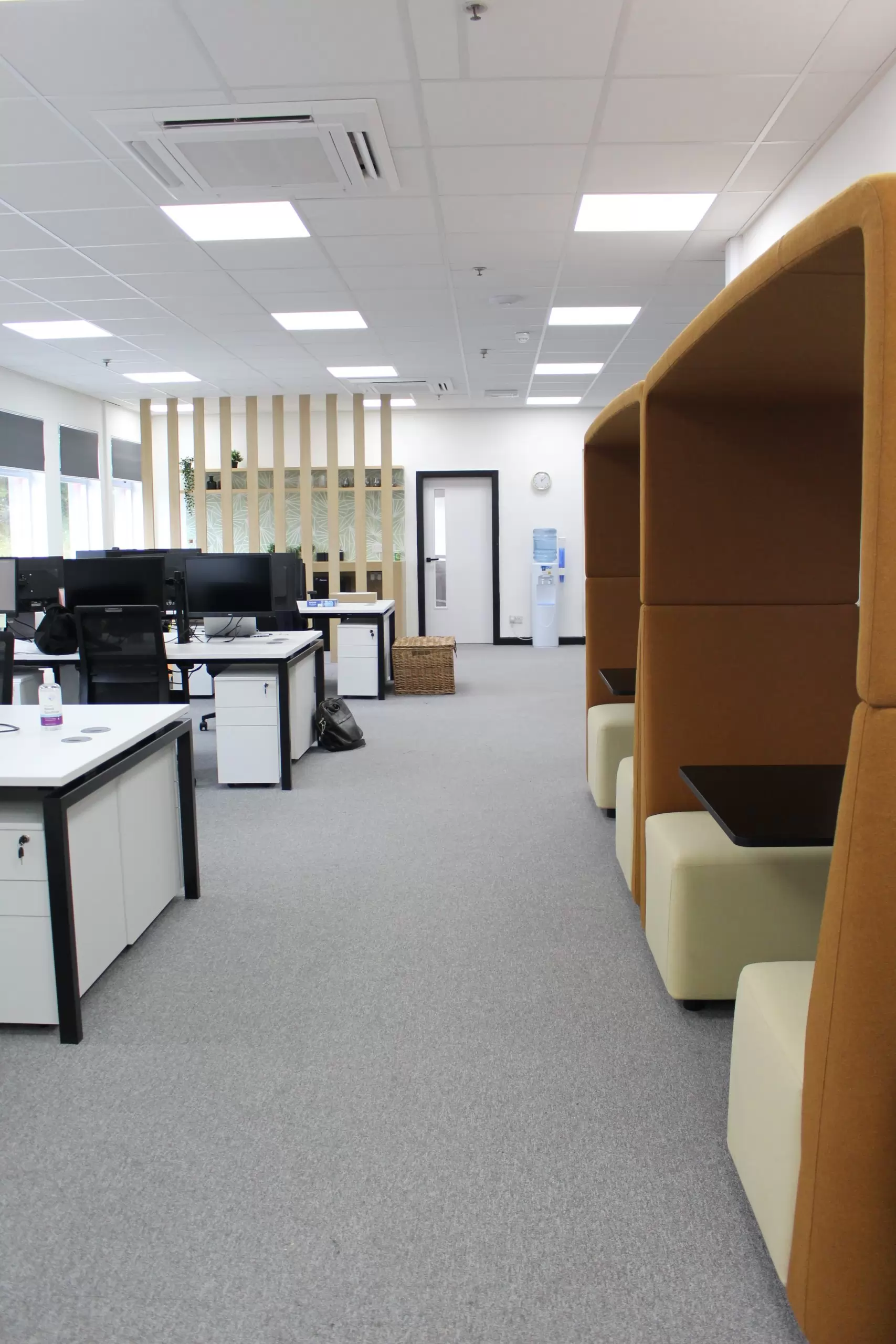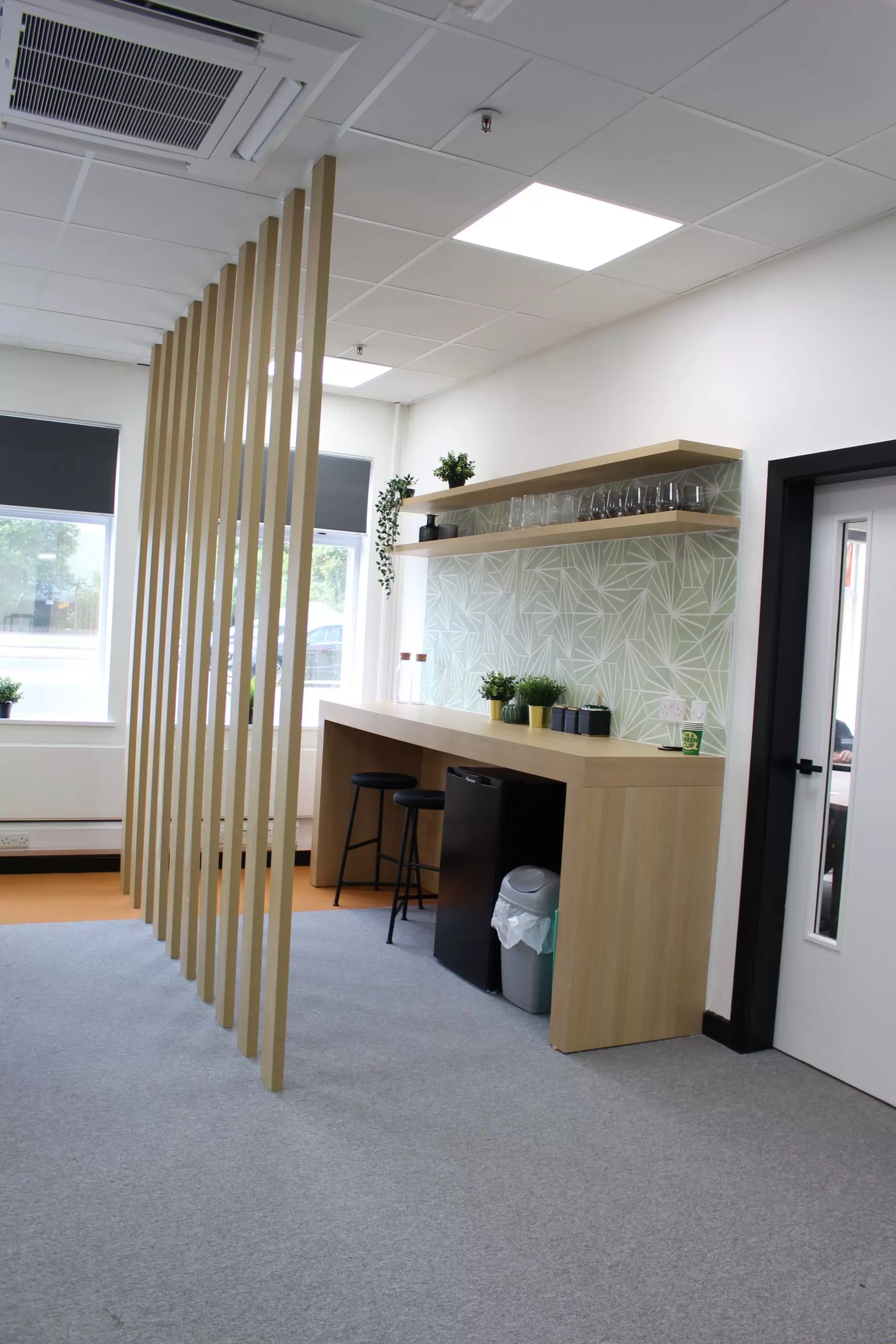 How we helped: Following our the successful transformation of Innova’s head office in Whetherby in 2020, the client asked us to take a look at their second office in Castleford, primarily used by their warehouse team. This job required a full demolition and replacement of existing ceiling tiles, tired flooring and wall finishes, and new furniture throughout. Within this scheme there was a reception, main office, boardroom, meeting rooms and private offices. The client wanted their warehouse staff to be able to enjoy the same flexible and fun working spaces that was evident their Wetherby office. Therefore, not only did we use bold bespoke vinyl wallcoverings, such as the Newmor one displayed within their collaboration area, but we also designed bespoke fitted storage within their meeting room and timber slat partitions within their main office, all designed in house. Adding a bespoke T-point with feature hexagon tiles and a floating shelf brought fresh life and creativity into what was once a dull space, whilst providing an extra zone for staff to take a well deserved break in. Another project delivered on budget and on time!