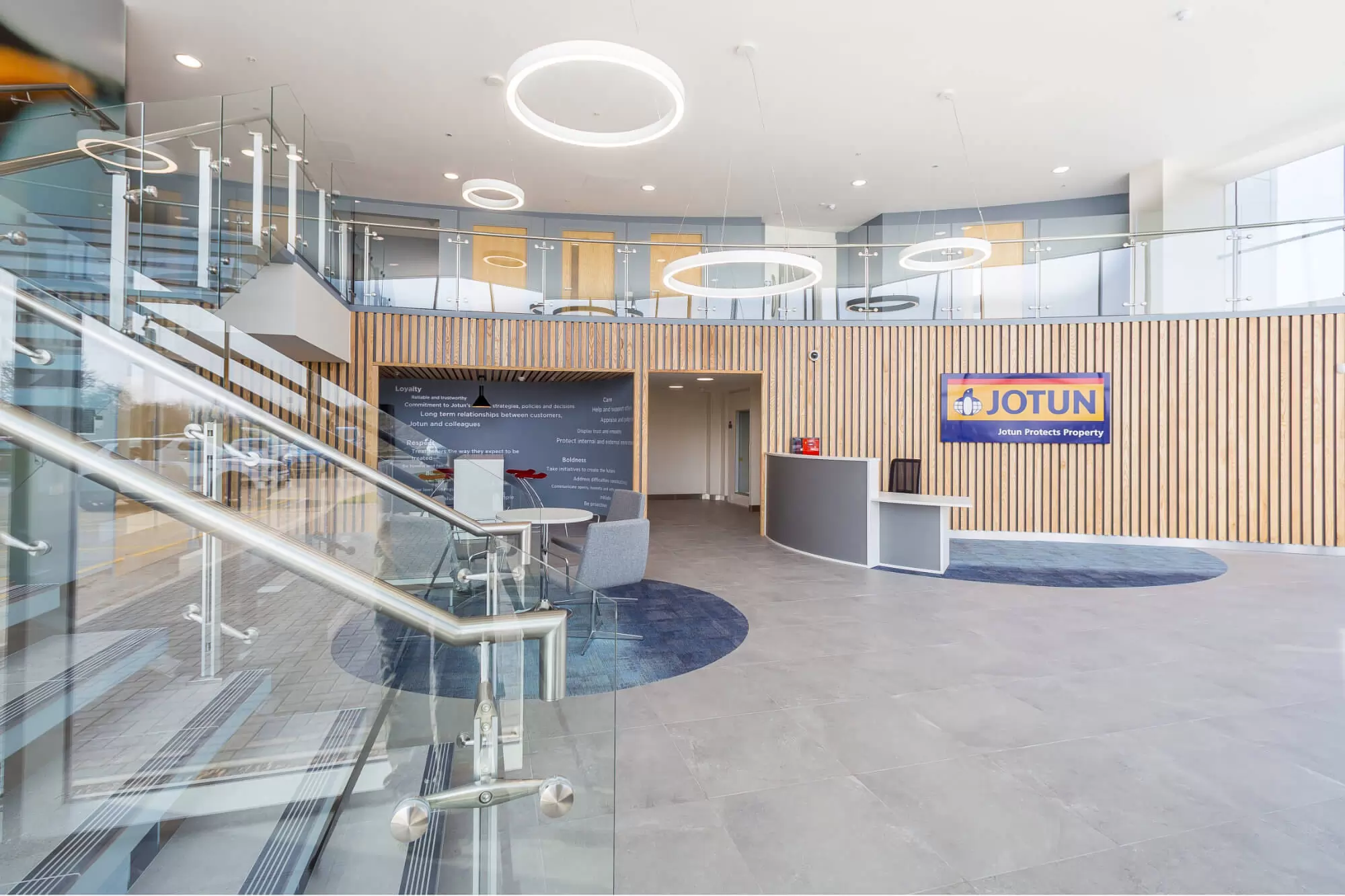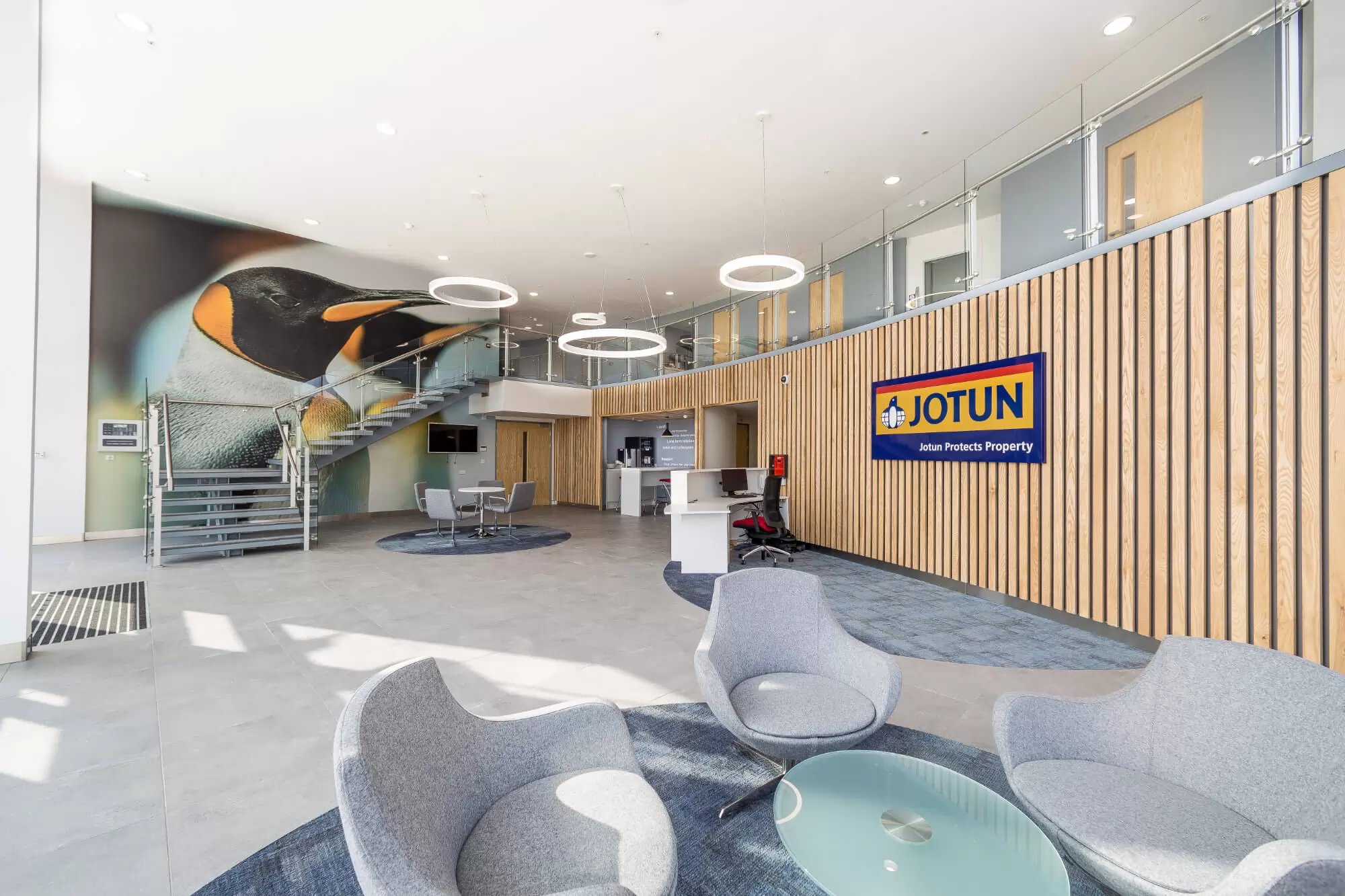 How we helped: Jotun is a major international company with offices in no fewer than 100 countries worldwide. Through pro-space consultancy involving all the teams to gain an understanding of how they operated and how we could assist in increasing productivity by creating a more efficient and inspiring workplace. This 15,800 square feet project included stripping the building back to the shell and re-creating all the major functions including an impressive reception space, open plan office areas, private zones, relaxation spaces, new washroom facilities, gym and meeting spaces. We also created a training academy in a separate location on the site where global training sessions are now held regularly.