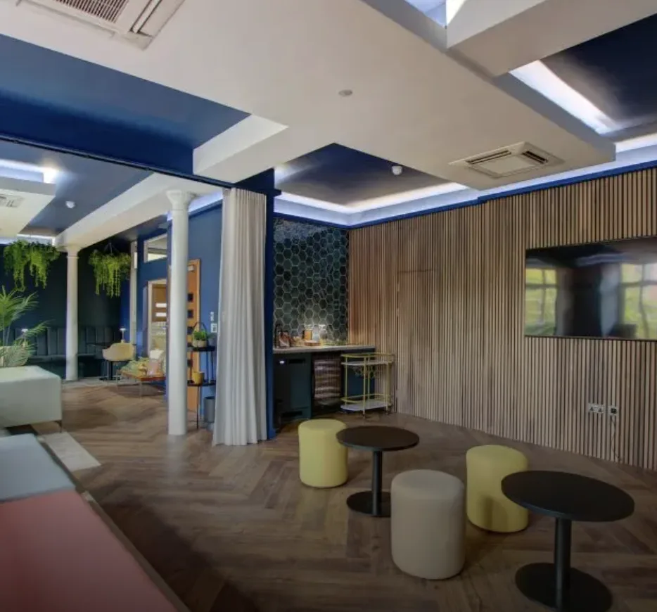 We were commissioned to design and create a sophisticated business lounge that would serve as a welcoming retreat for tenants in the building. The result is a stylish and versatile hub packed with premium features, including stepped seating for presentations, a state-of-the-art Sanomat coffee machine, elegant banquet seating, and a sleek wooden-panelled wall with a hidden storage room and an integrated TV. Comfortable sofas add a relaxed touch, completing the space.