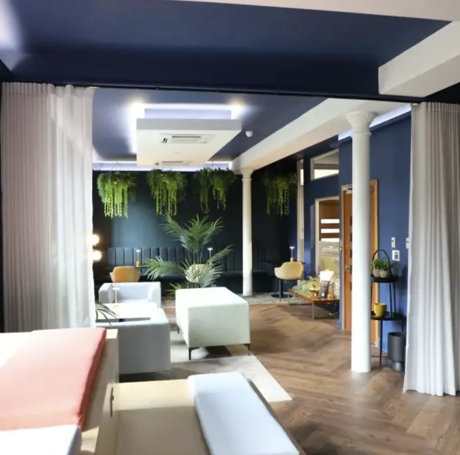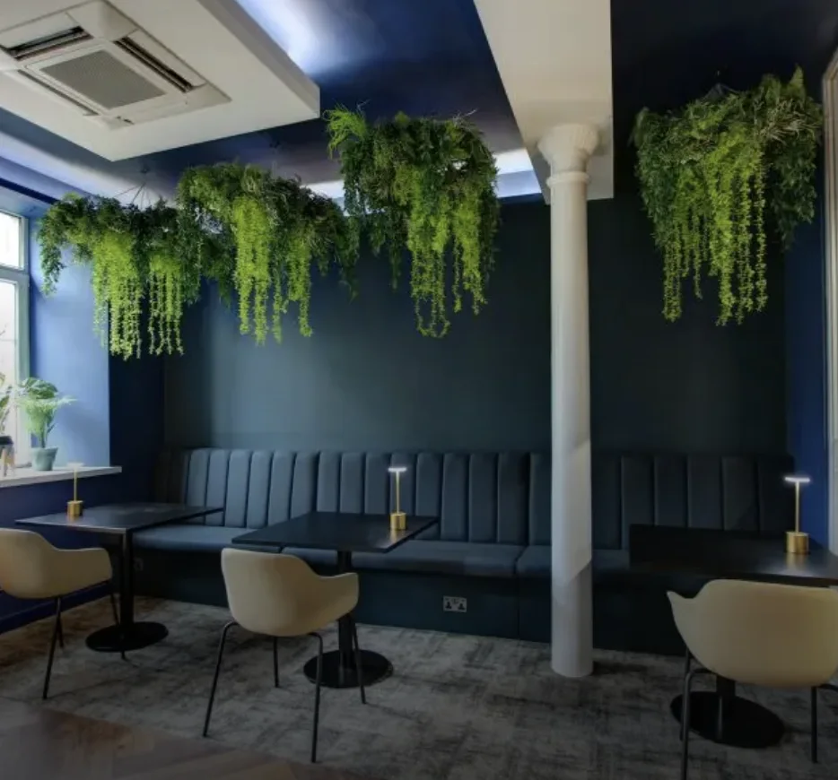 To enhance the ambiance, we incorporated low-level lighting from dropped bulkheads and used deep blue tones on the walls and ceiling, creating a cosy and moody atmosphere. This design choice beautifully contrasts with the lush greenery, making it a standout feature of the space.